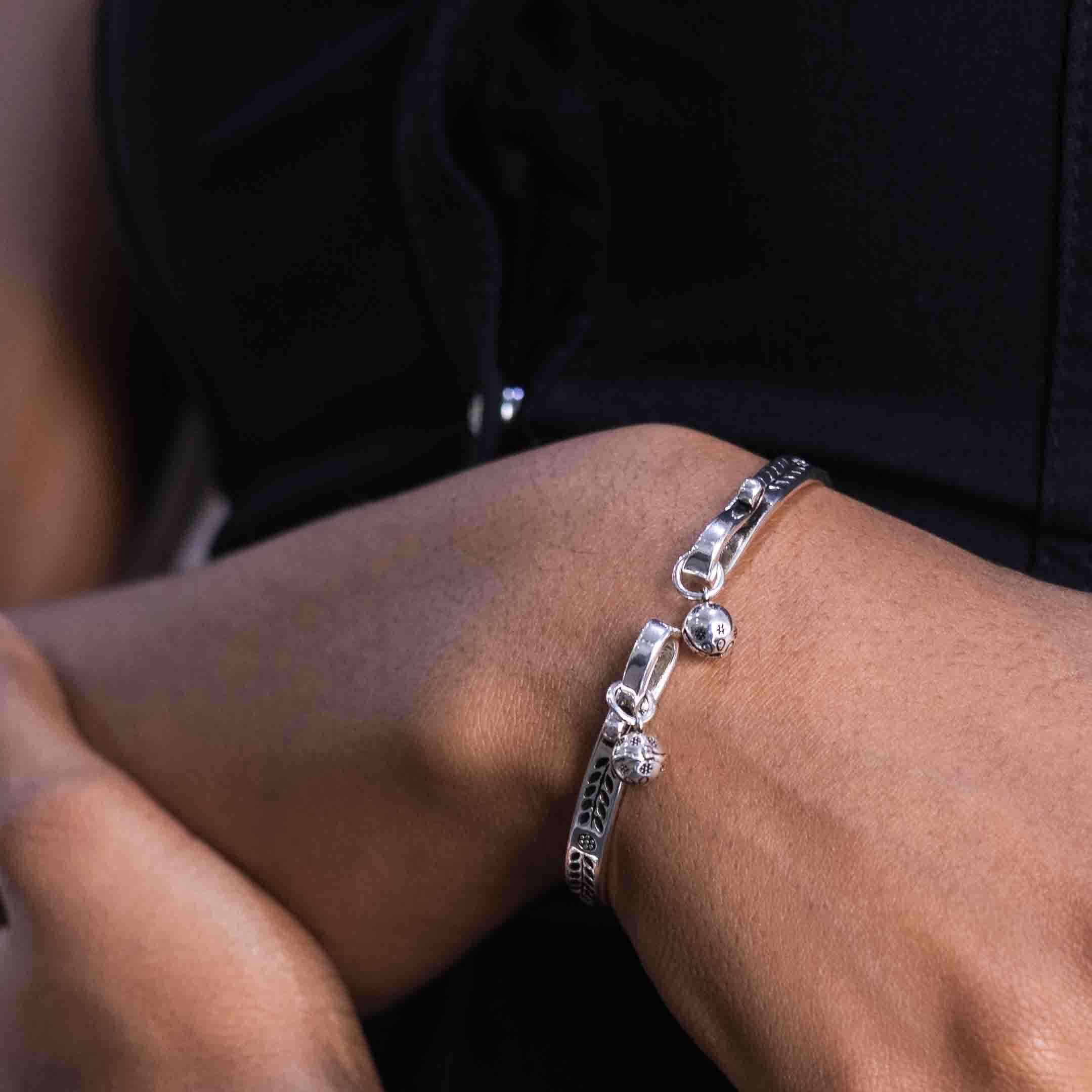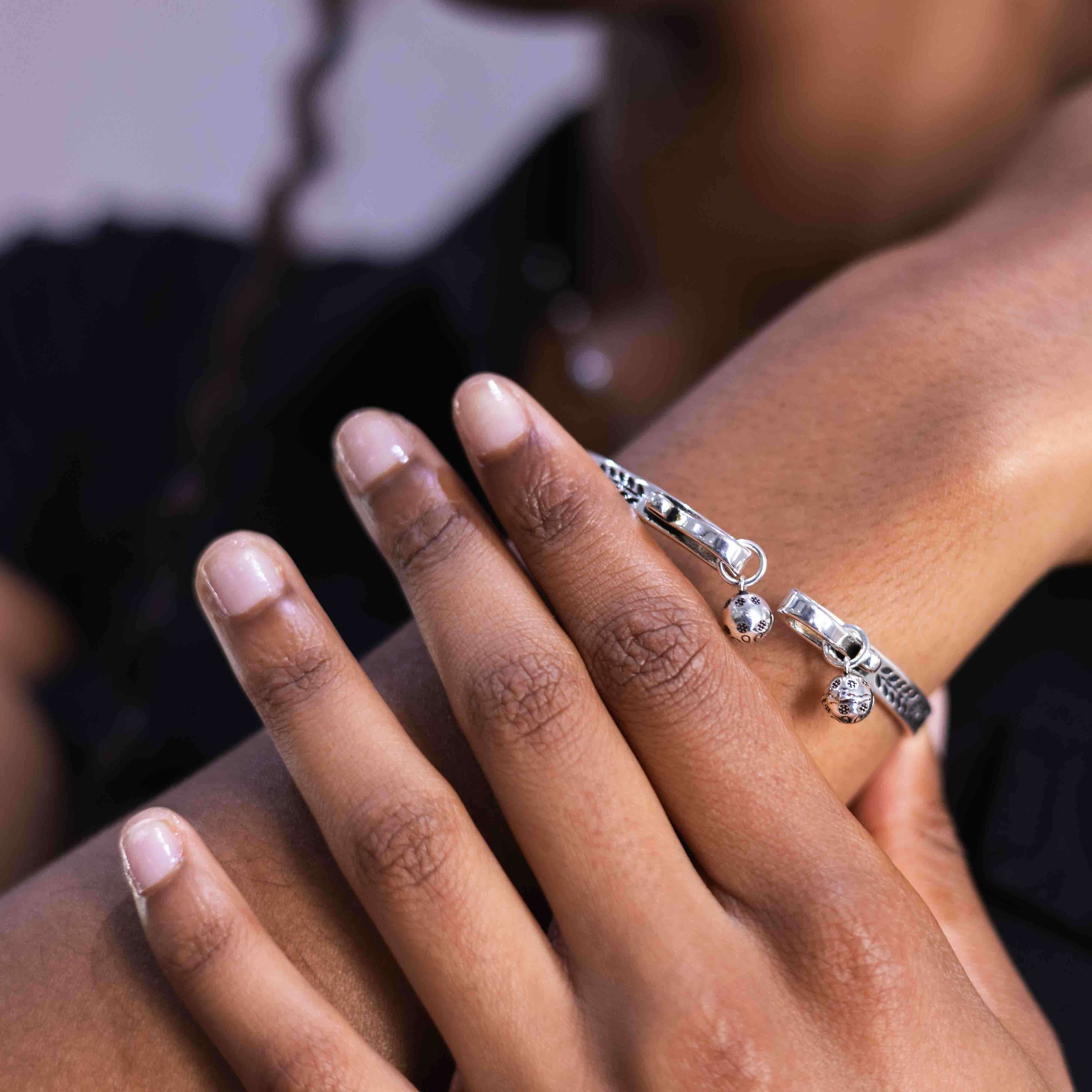 Handcrafted 925 Sterling Silver Bell Bangle, this Tibetan-inspired bangle features an elegant leaf detail and a choice of plain or patterned bell charm. Durable, skin-safe, and adjustable for a custom fit.