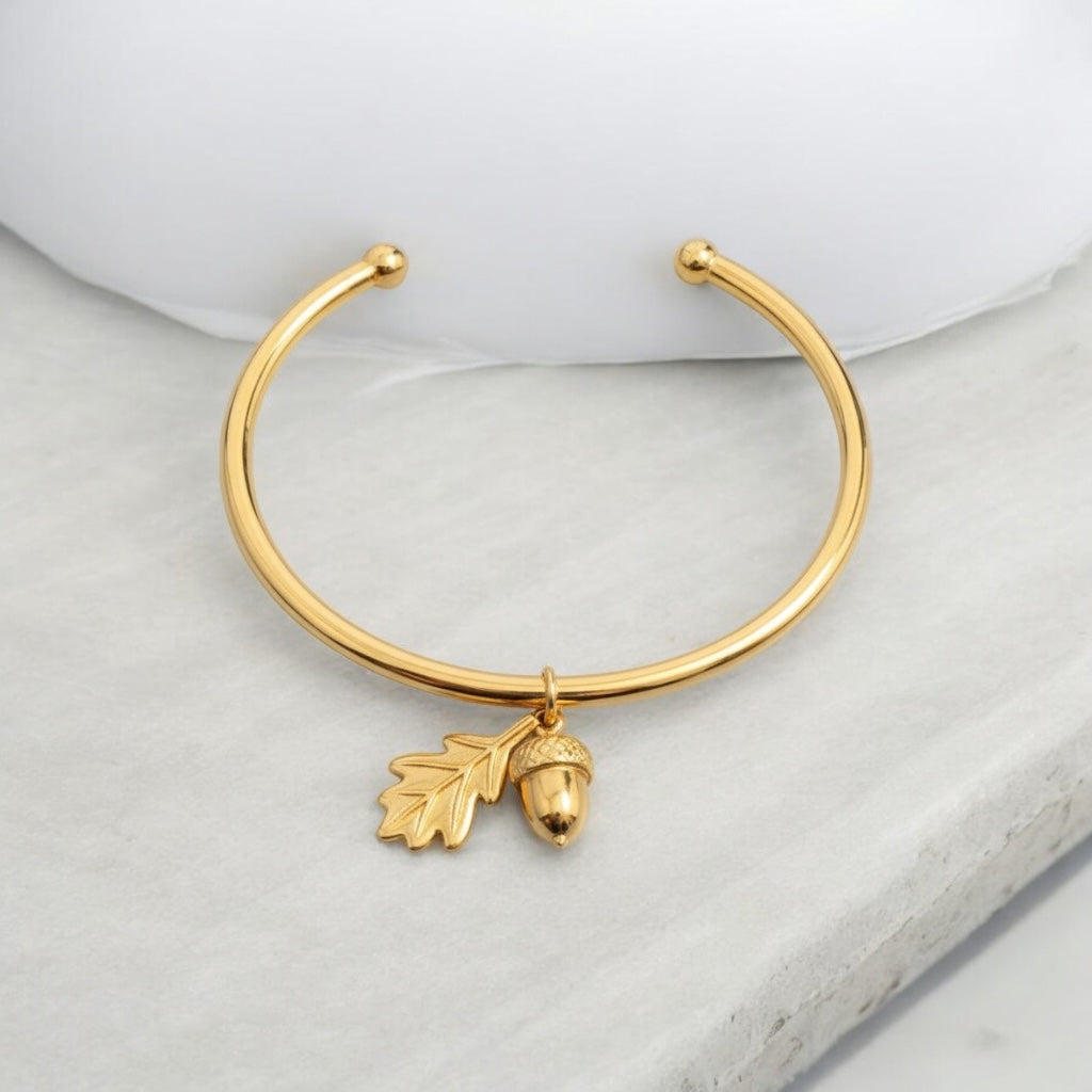 Designed with an adjustable open silhouette, it offers everyday comfort while the acorn and leaf charm adds symbolic meaning, representing resilience, growth, and quiet strength. Created with intention, this piece is made for those who value craftsmanship, longevity, and jewellery that holds meaning beyond trend.
