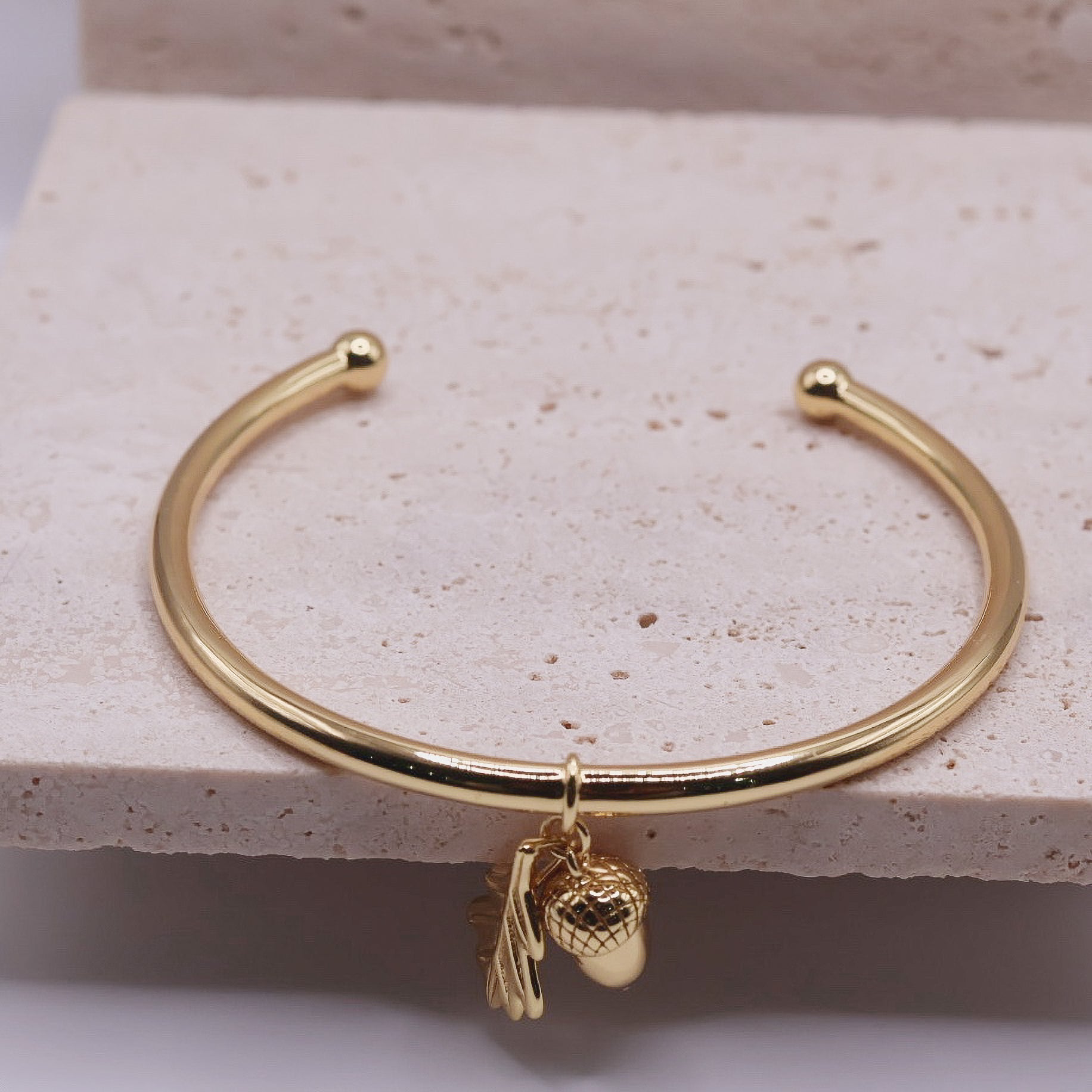 Acorn & Oak Leaf Open Bangle – 18K Gold Plated Sterling Silver