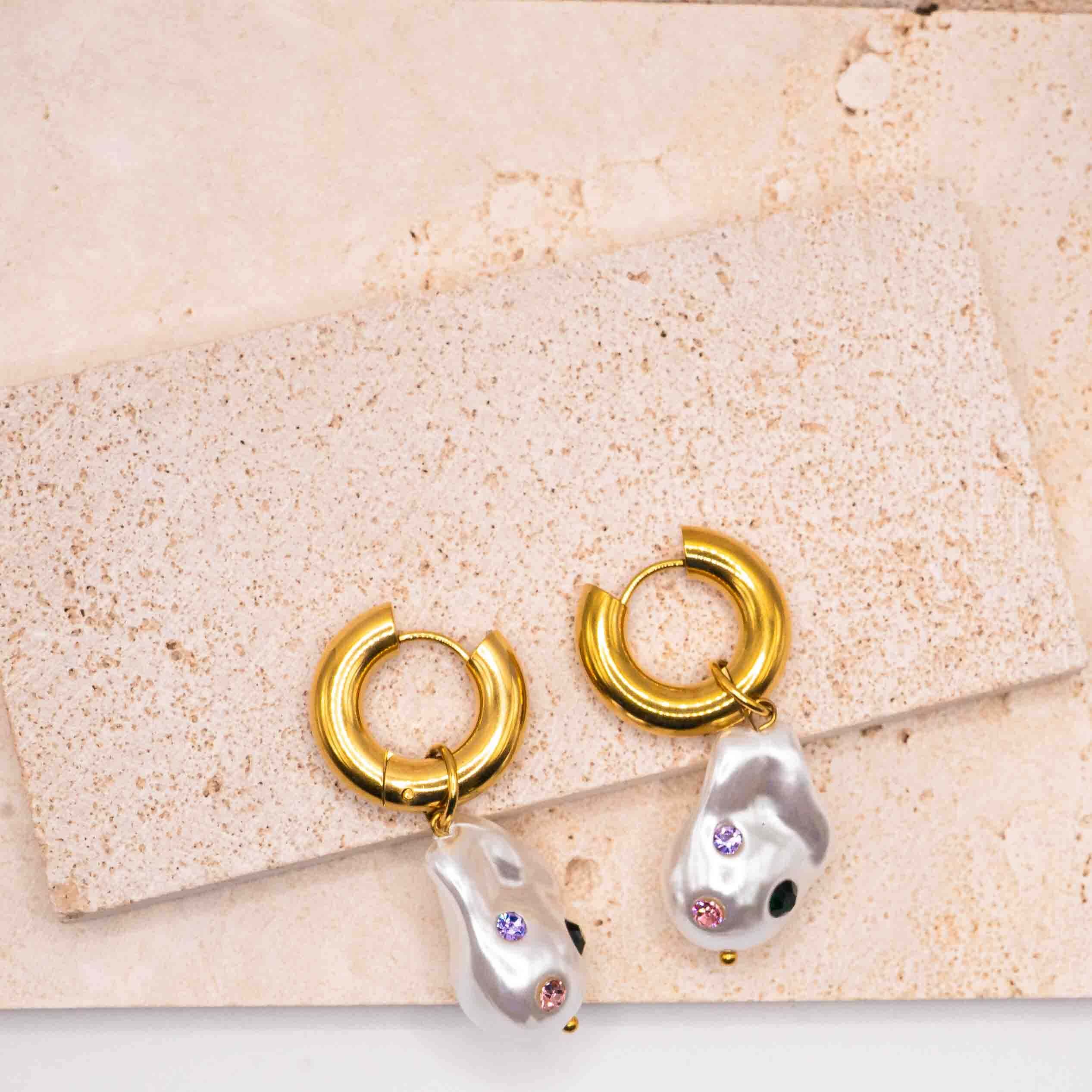 A touch of modern art meets classic gold. These sculptural 12mm 14K PVD Gold Hoops feature an abstract baroque pearl-style charm accented with soft lilac and blush crystal detailing. Crafted from premium stainless steel and coated with 14K gold PVD plating for lasting radiance, they balance boldness with effortless elegance.