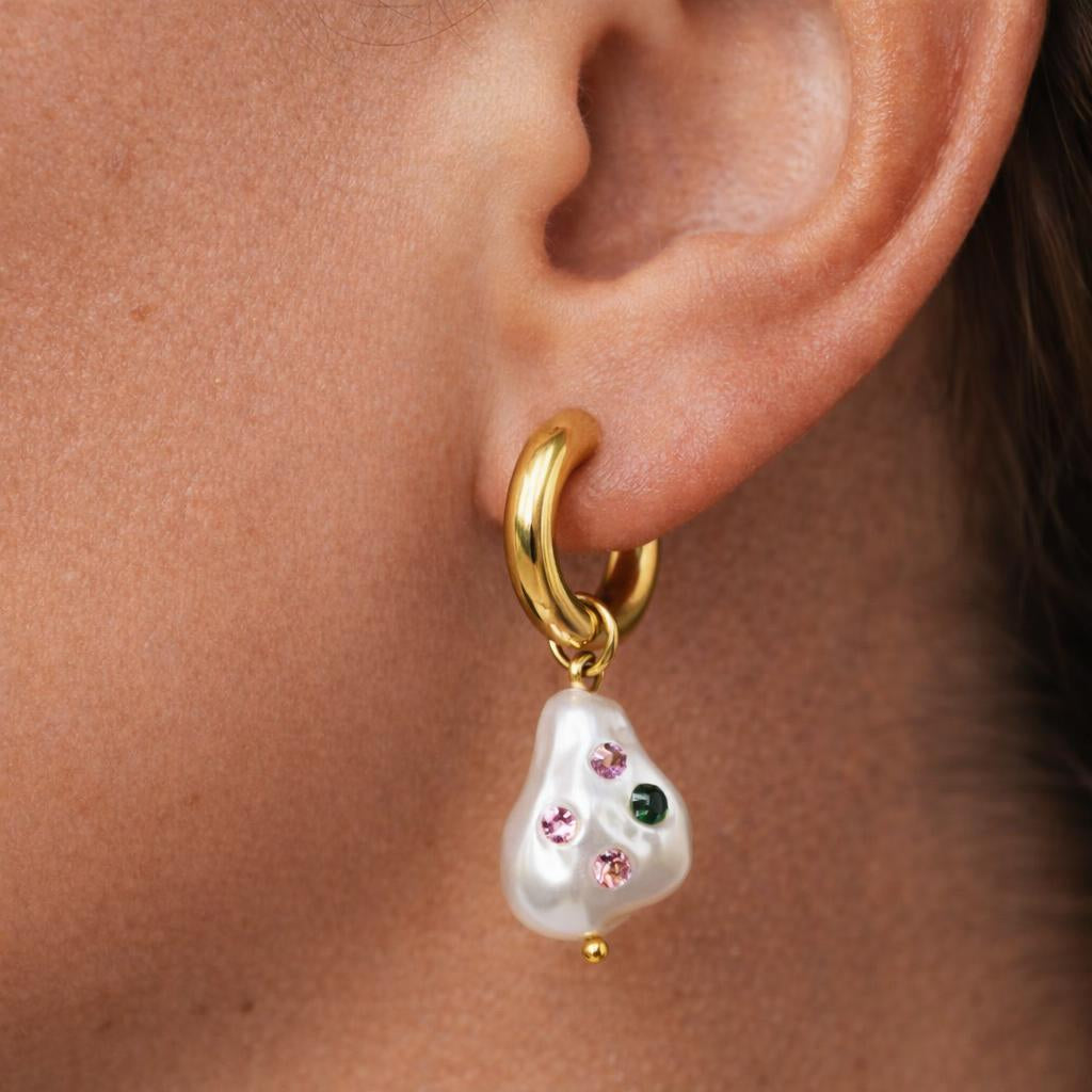 Baroque Pearl Drop Huggie Hoops, a touch of modern art meets classic gold. These sculptural 12mm 14K PVD Gold Hoops feature an abstract baroque pearl-style charm accented with soft lilac and blush crystal detailing. Crafted from premium stainless steel and coated with 14K gold PVD plating for lasting radiance, they balance boldness with effortless elegance.