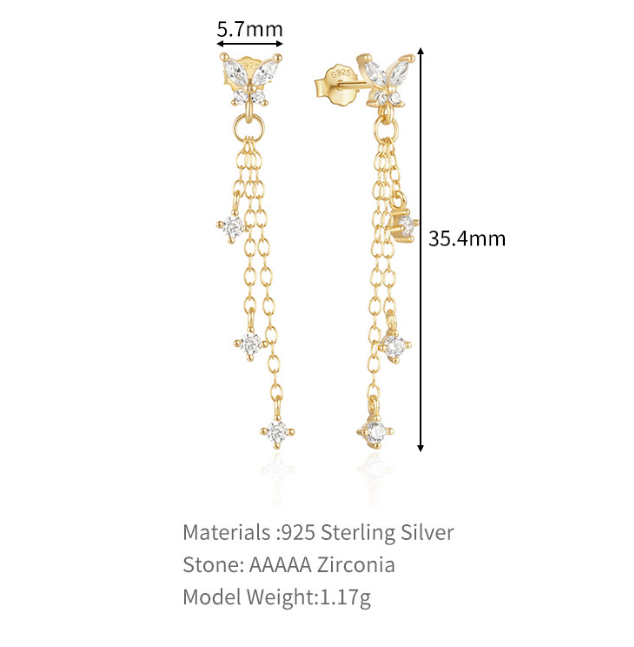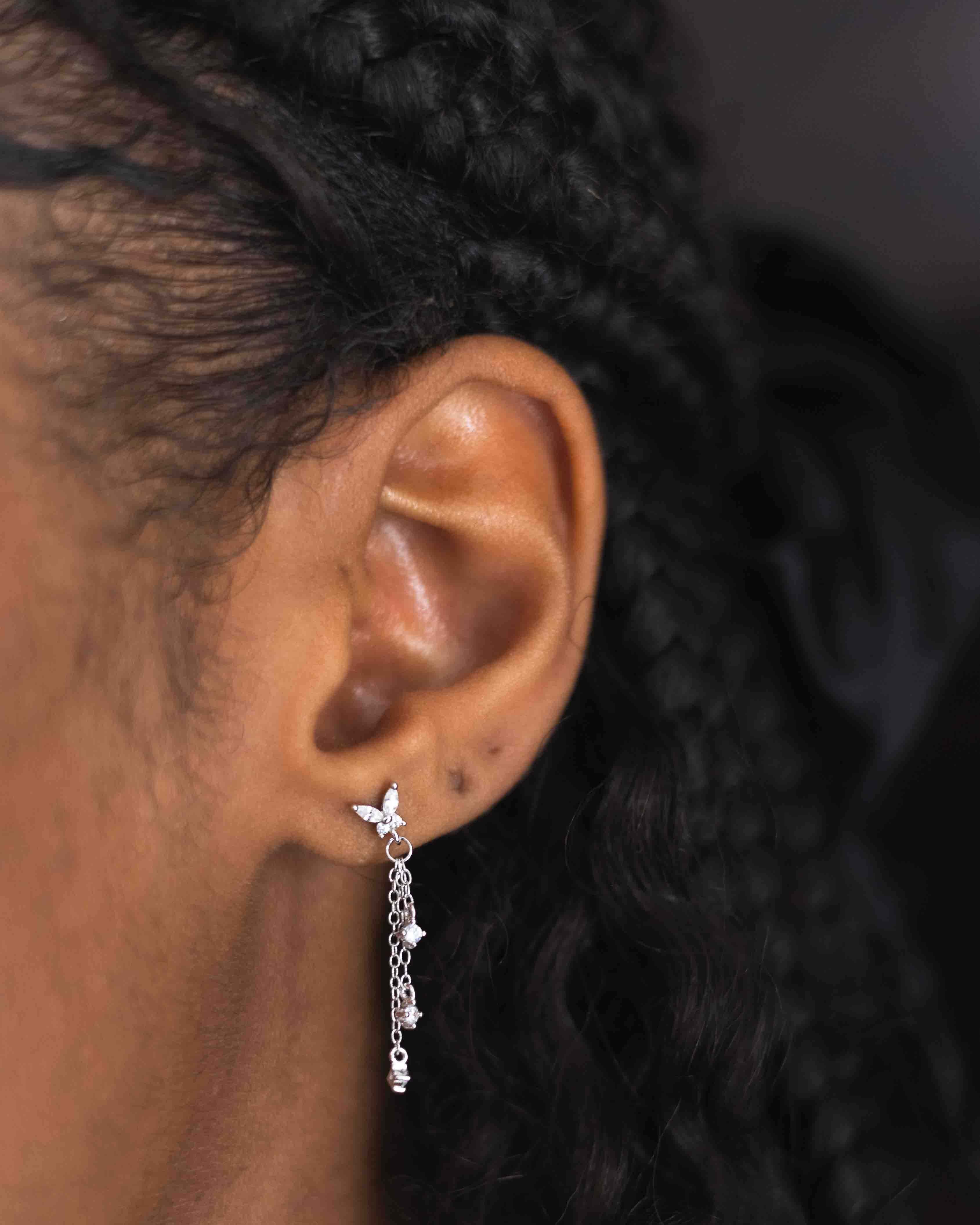 These delicate butterfly stud earrings feature a fine chain drop finished with CZ accents that catch the light beautifully. Designed to move with you, they add elegance without feeling heavy.