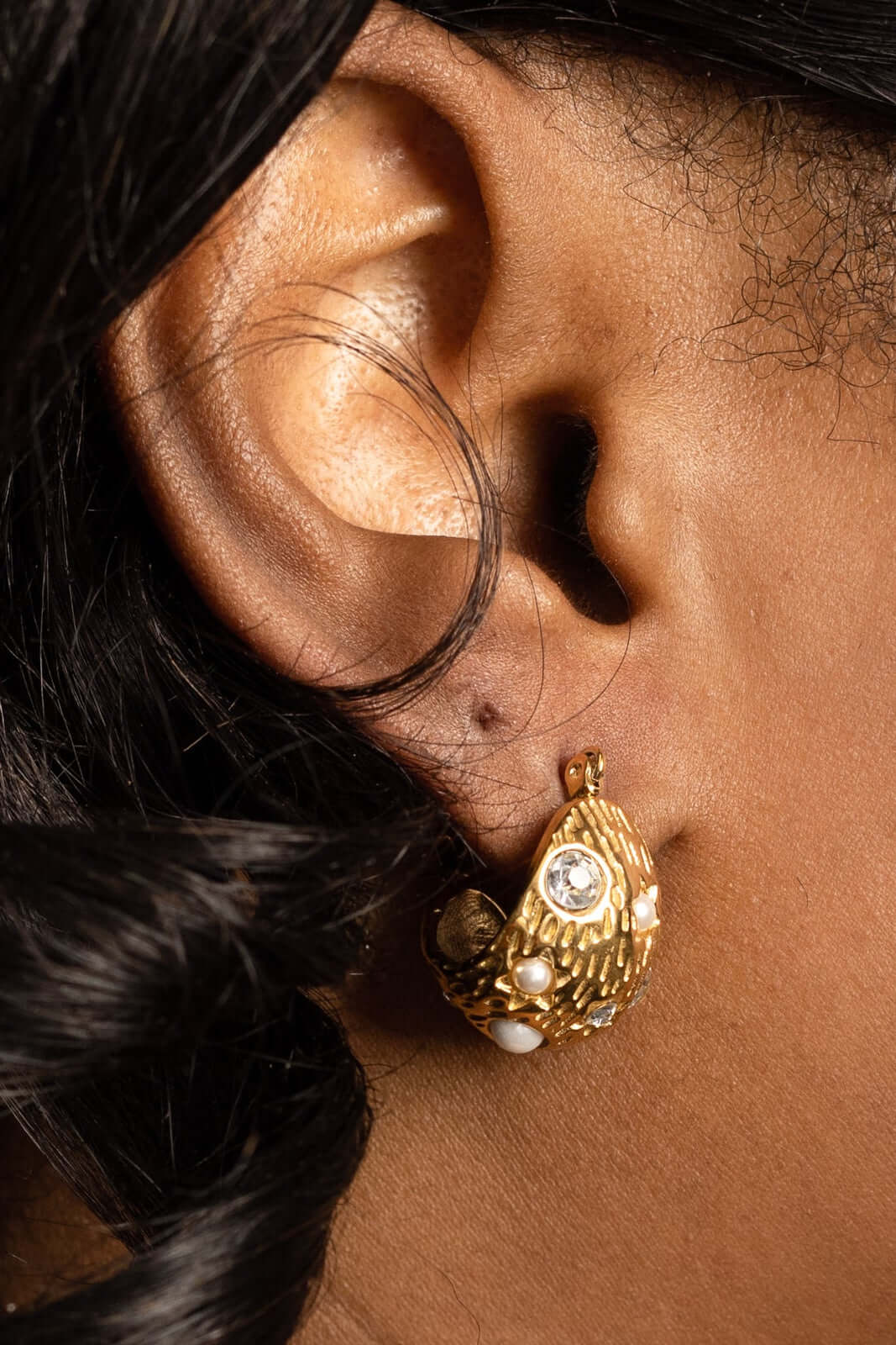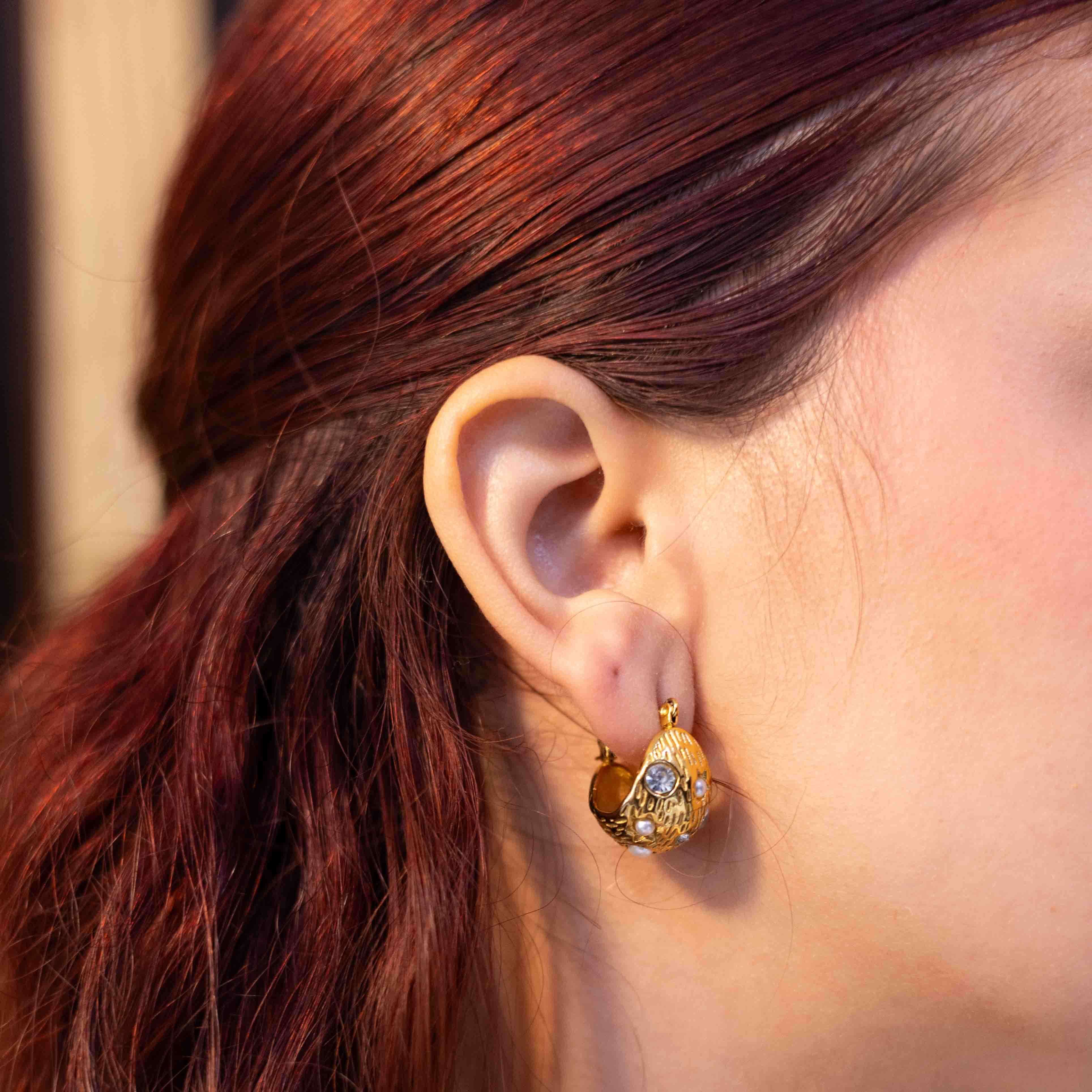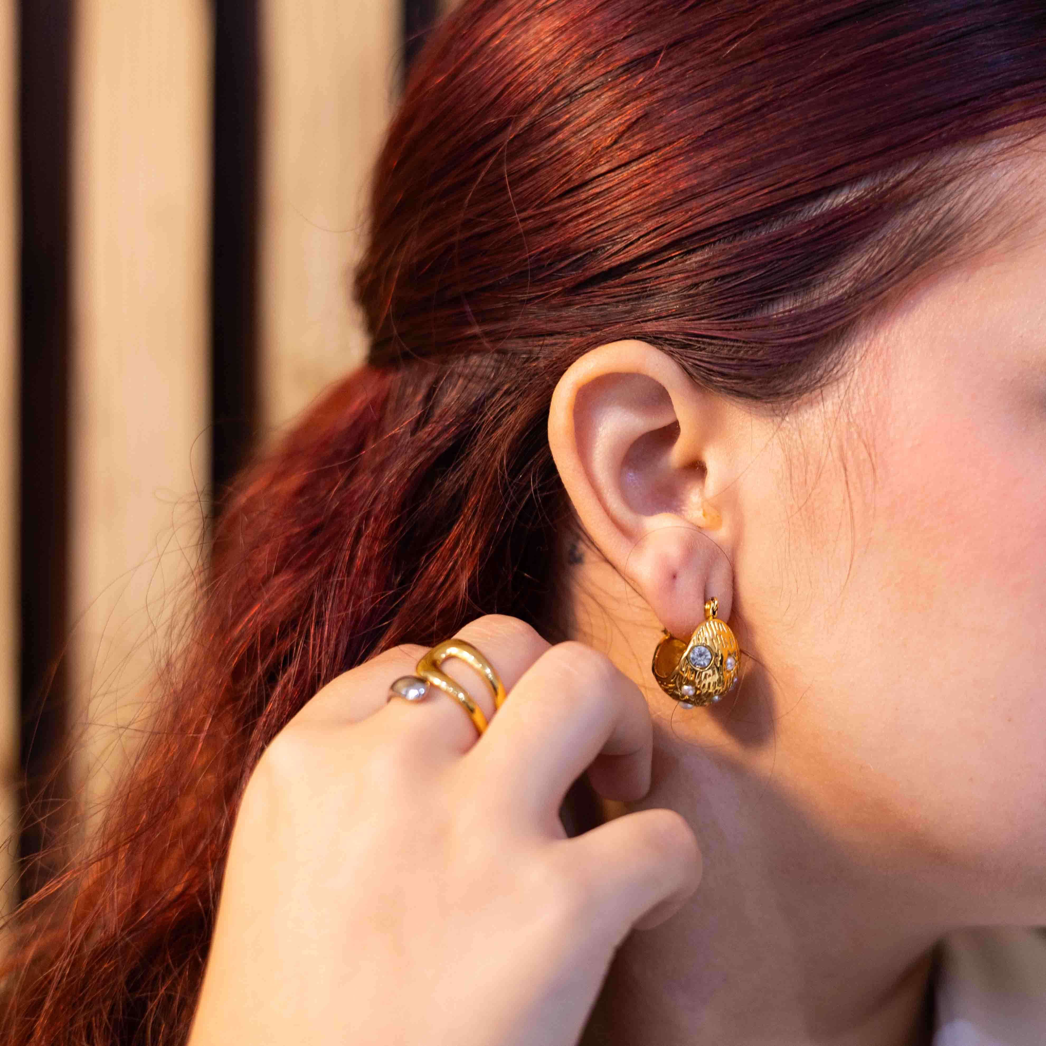 Bold, sculptural and beautifully expressive. These Sculpted Pearl-Embellished Hoops bring a modern, artistic twist to the classic chunky earring. Designed with a textured 18K PVD gold-plated finish and adorned with soft pearl accents and crystal detailing, they strike the perfect balance between statement and sophistication.