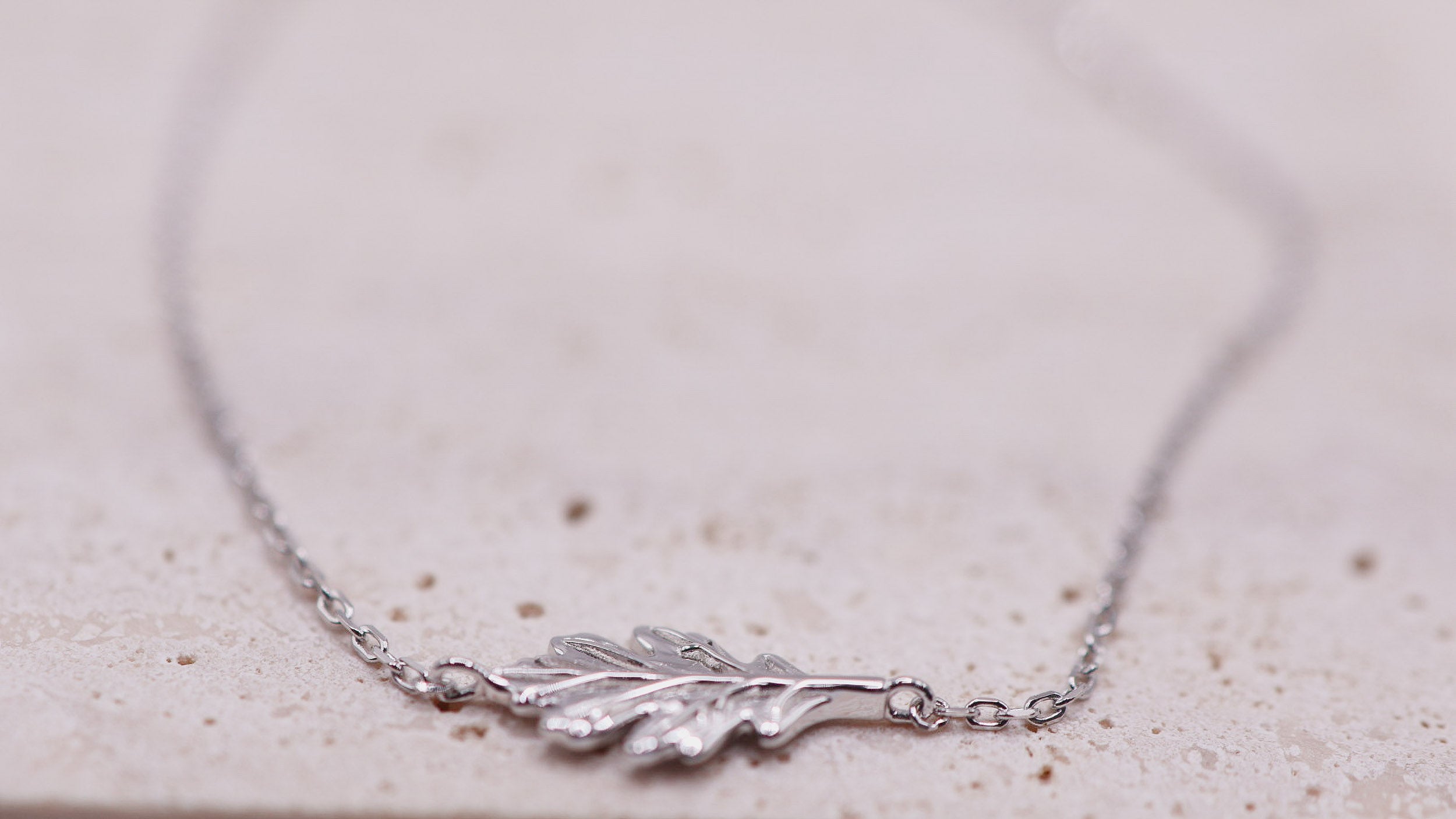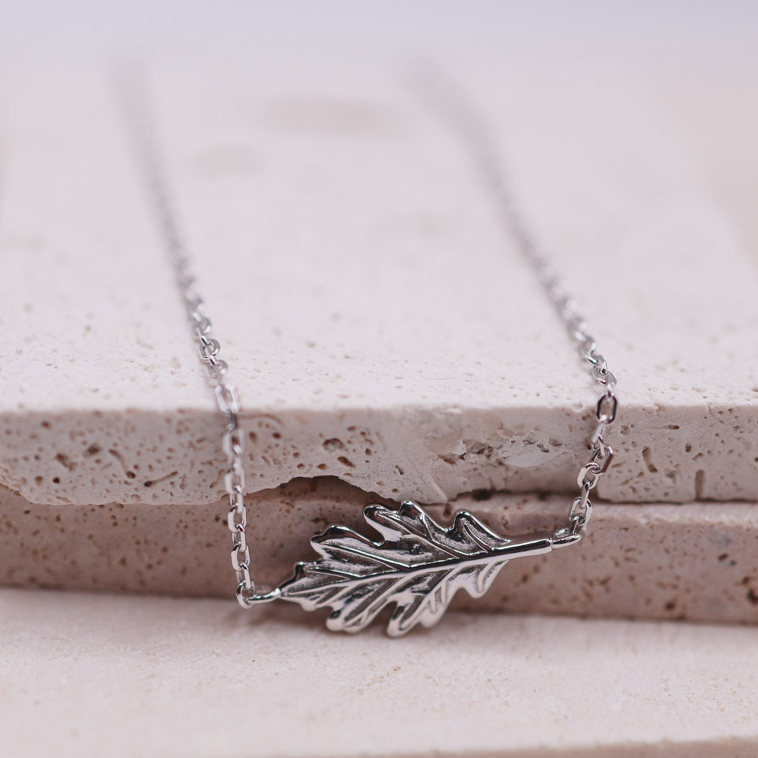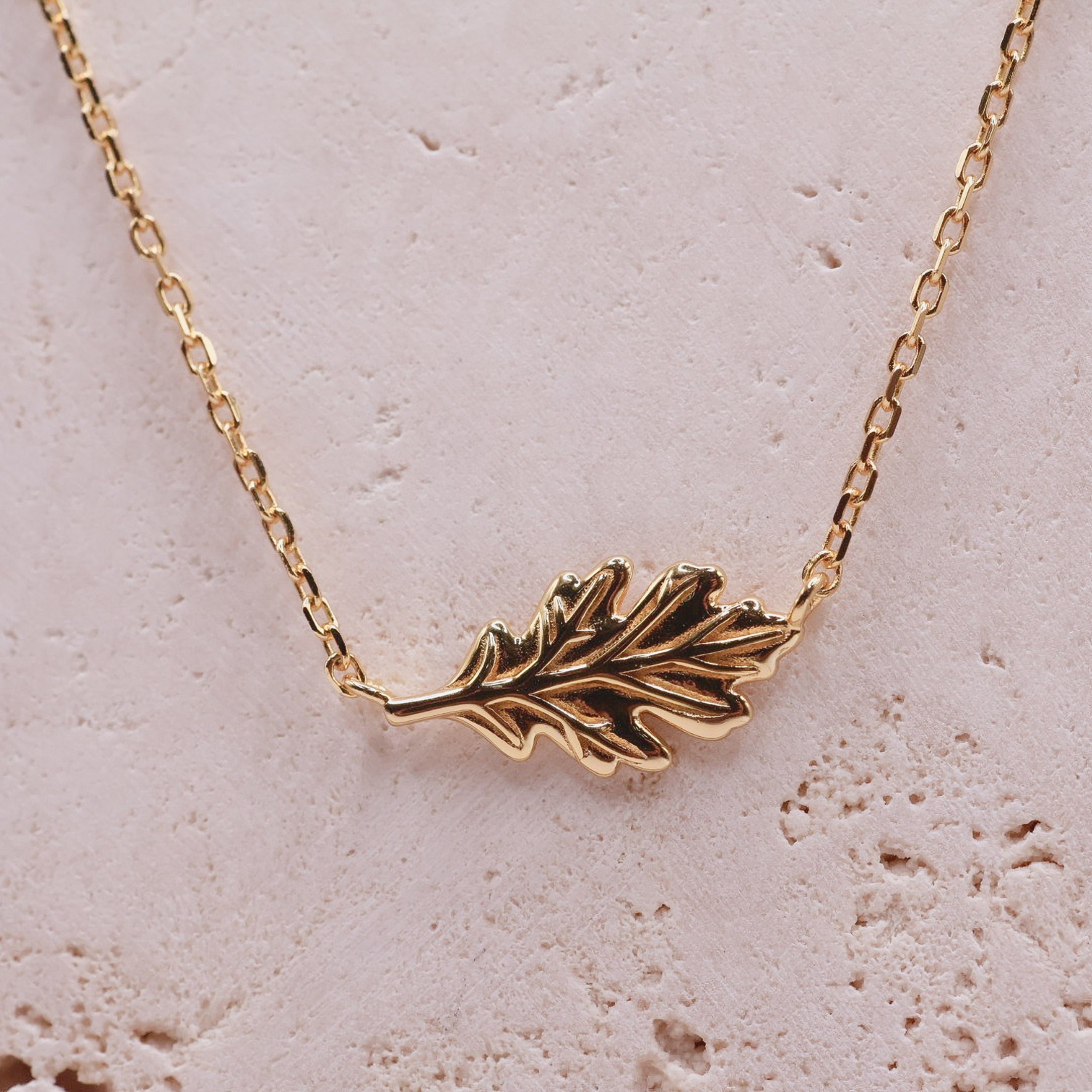 The Sculpted Oak Leaf Necklace features a finely sculpted oak leaf motif suspended from a delicate link chain. Crafted with intention, the leaf is formed as a single contoured element, with defined veining and softly sculpted edges that create a refined yet distinctive focal point.