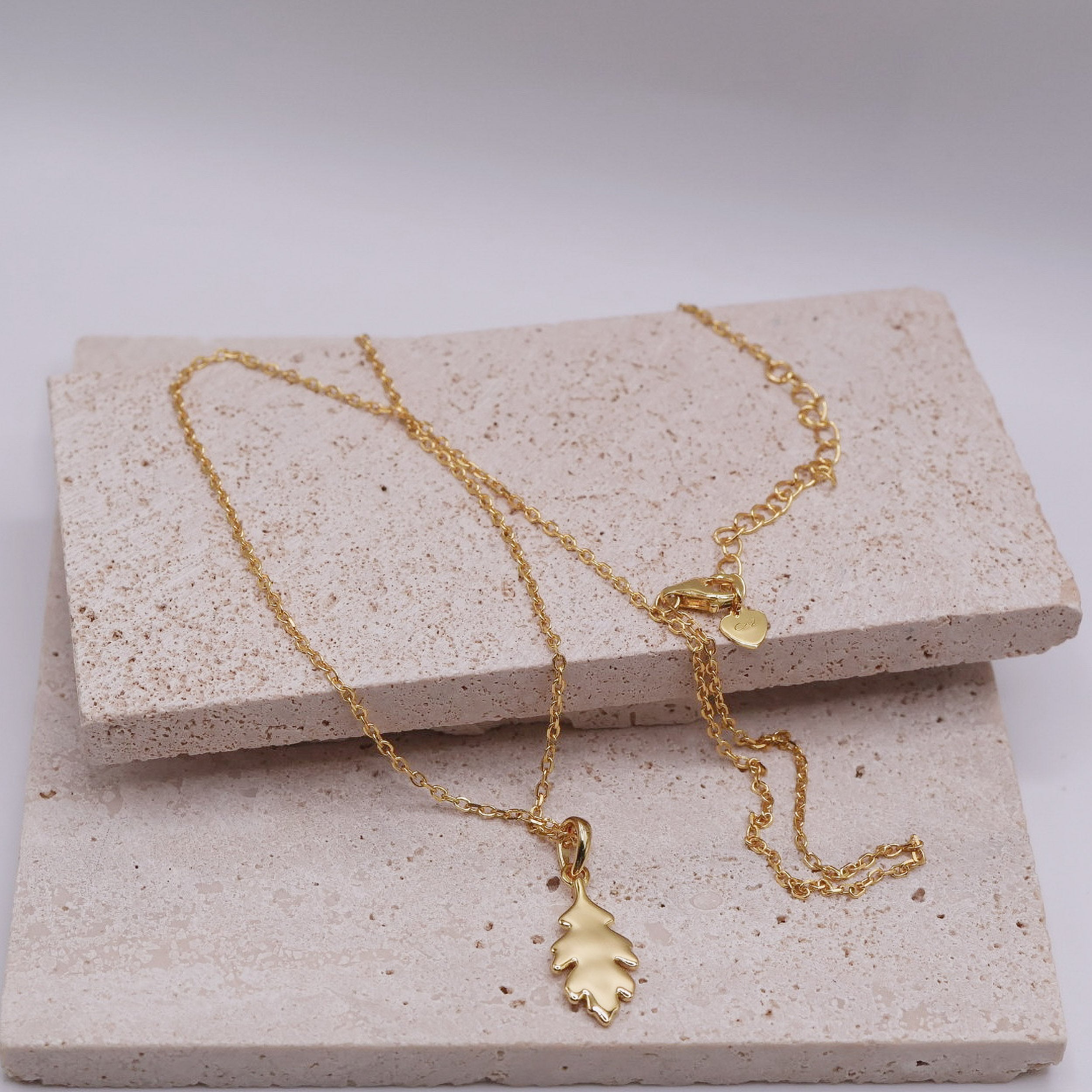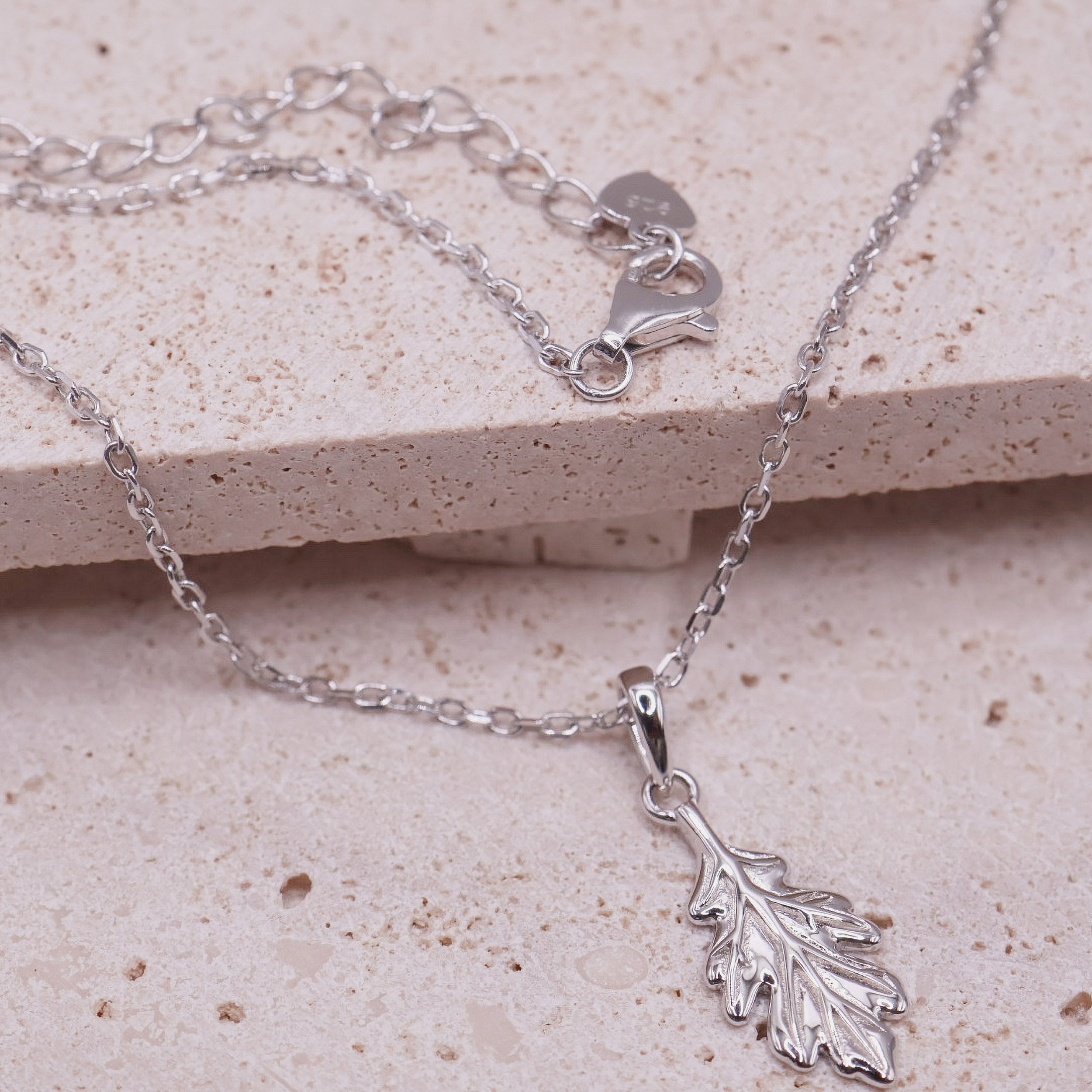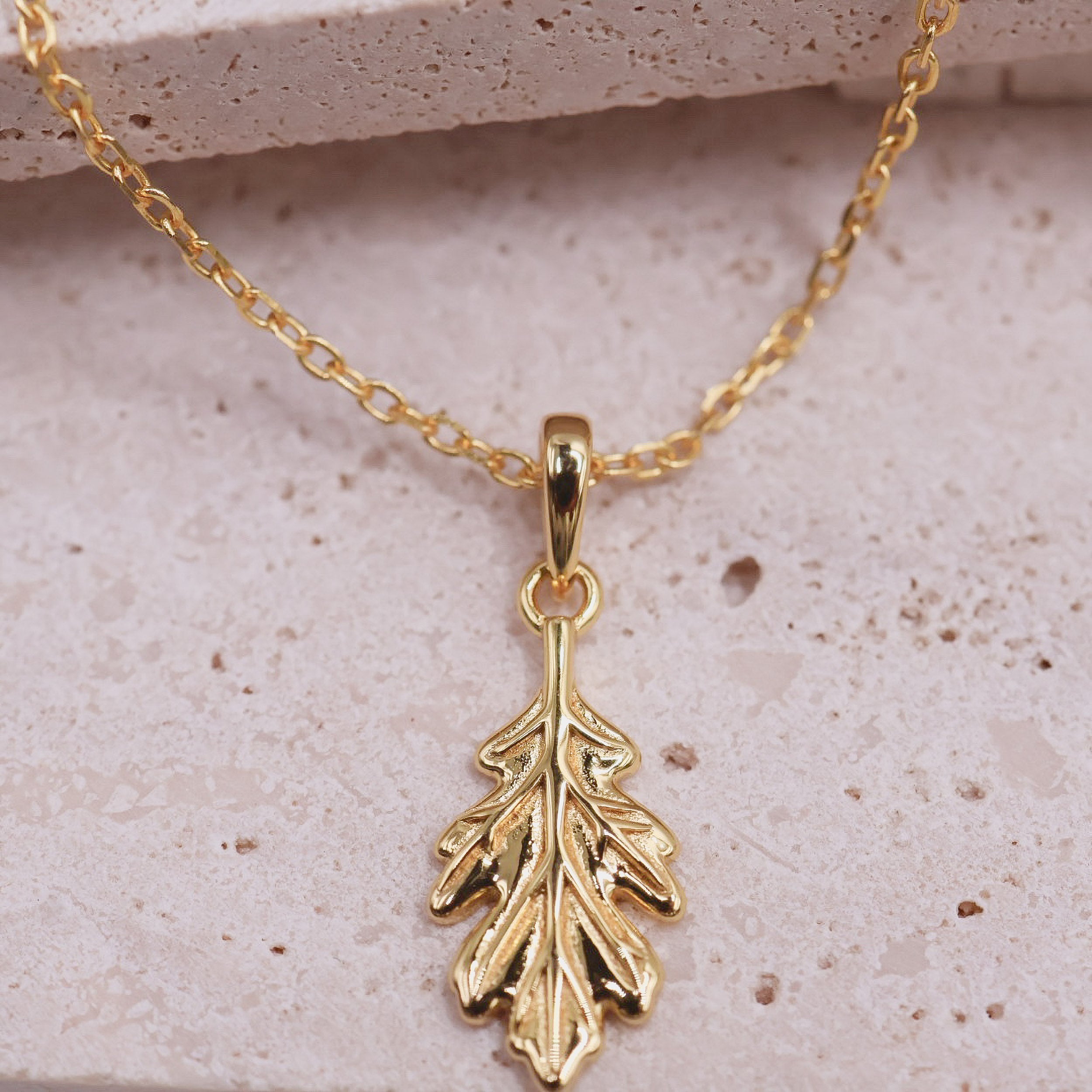 The Sculpted Oak Leaf Necklace features a finely contoured oak leaf pendant with raised veining and softly sculpted edges, suspended from a delicate chain. Designed to sit effortlessly at the collarbone, it offers a refined way to wear meaning every day.