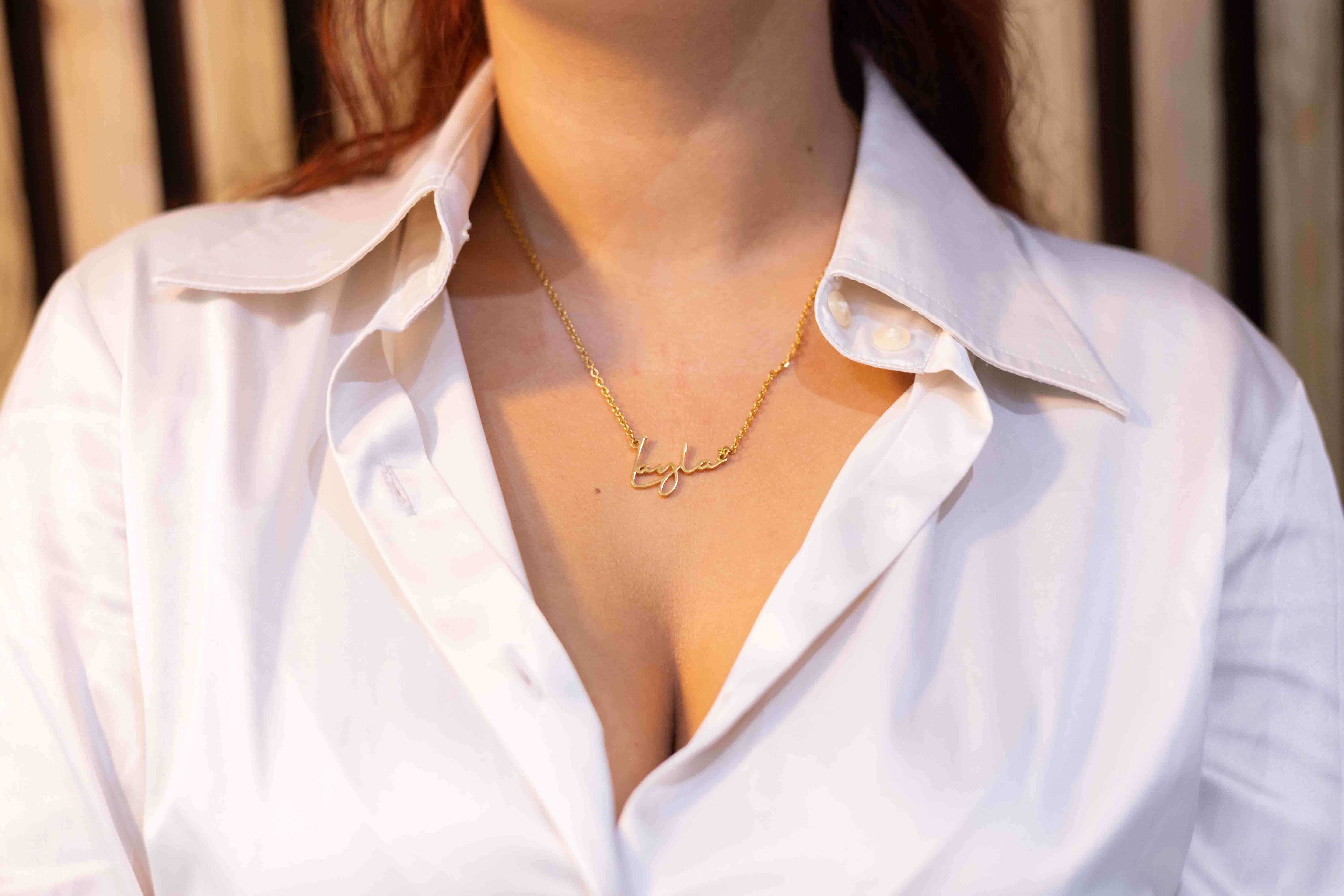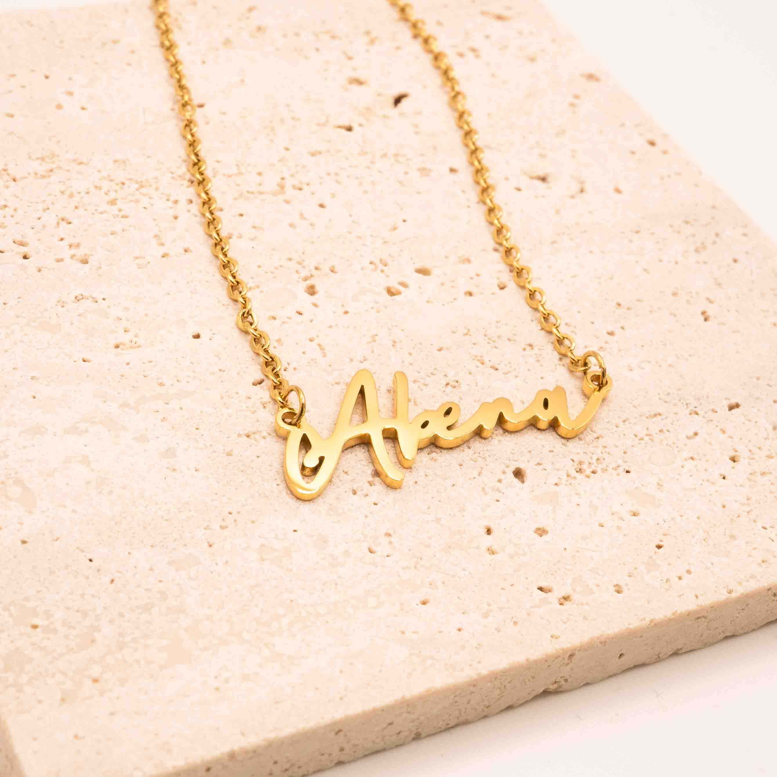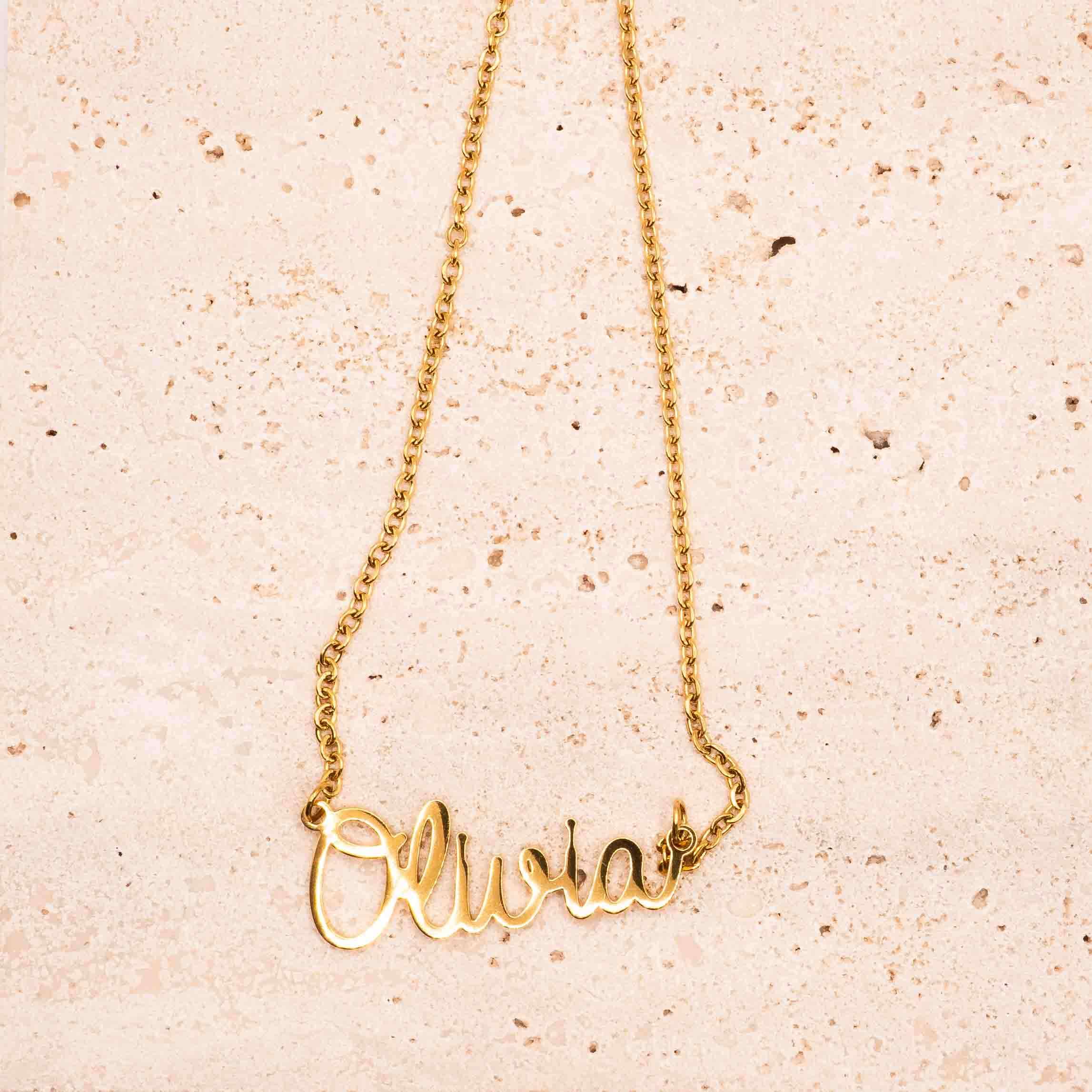 A delicate and meaningful custom Personalised Name Necklace featuring your chosen name or word in a sleek, modern font. Crafted from waterproof, tarnish-resistant 18K gold PVD over 316L stainless steel, it’s perfect for everyday wear—even in the shower or gym.
