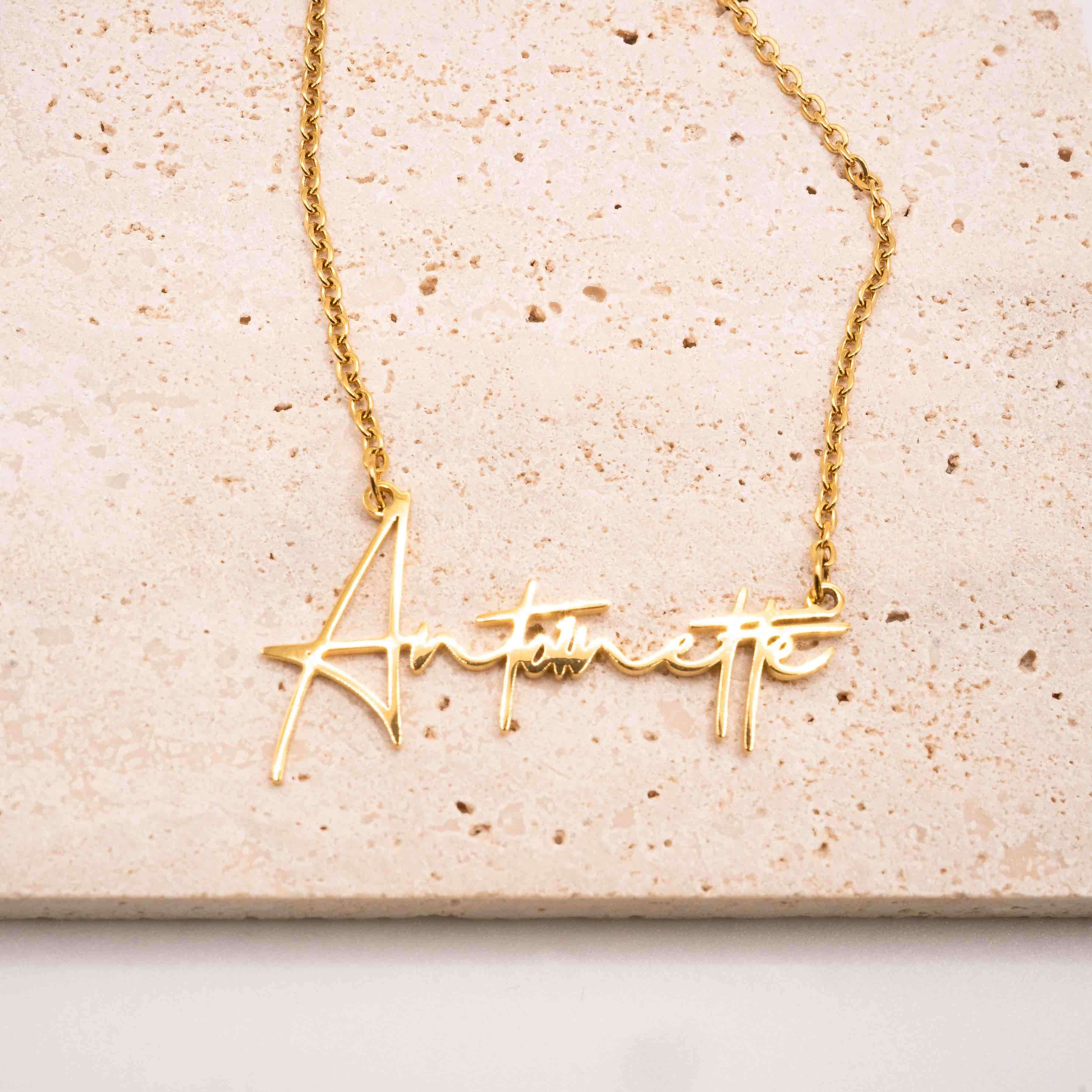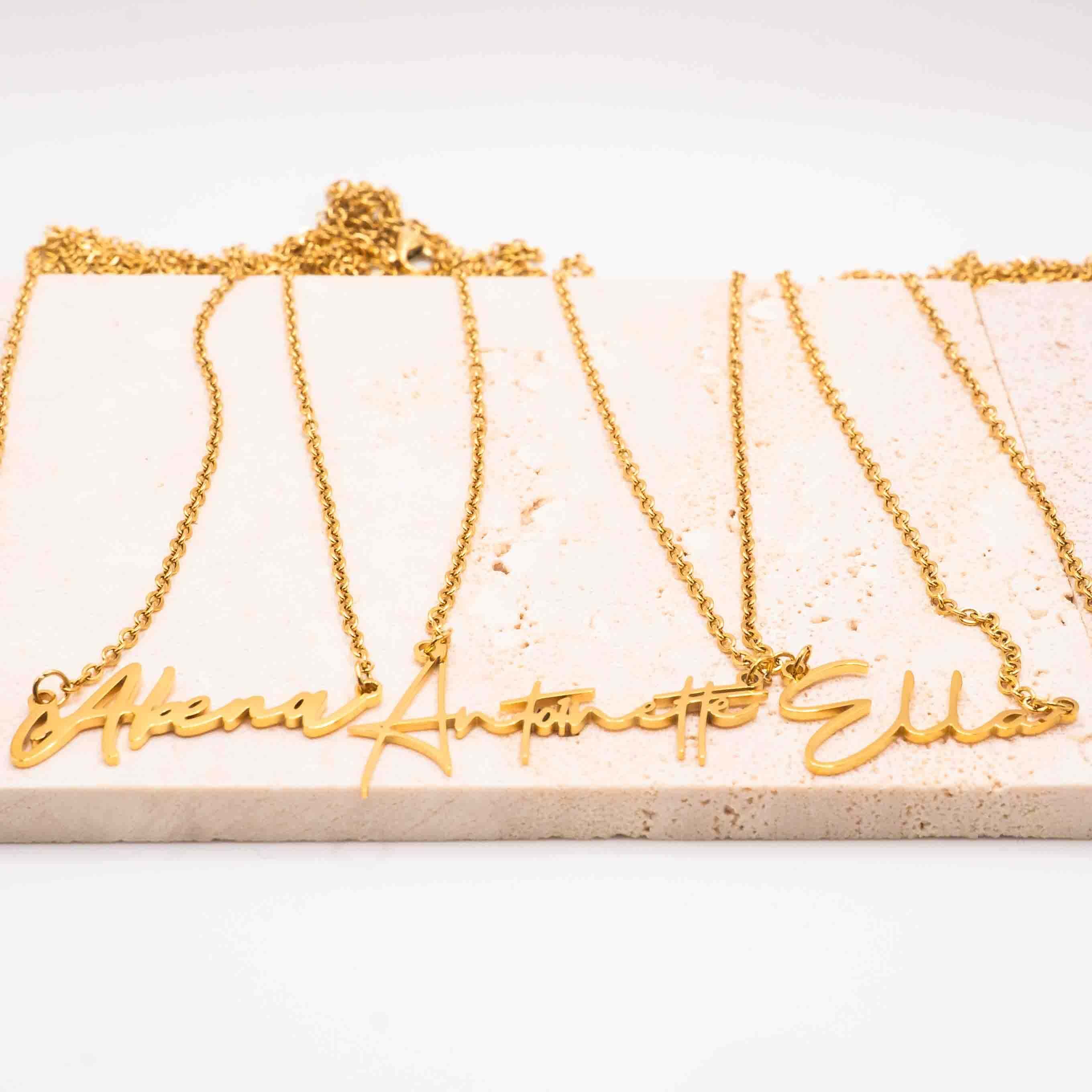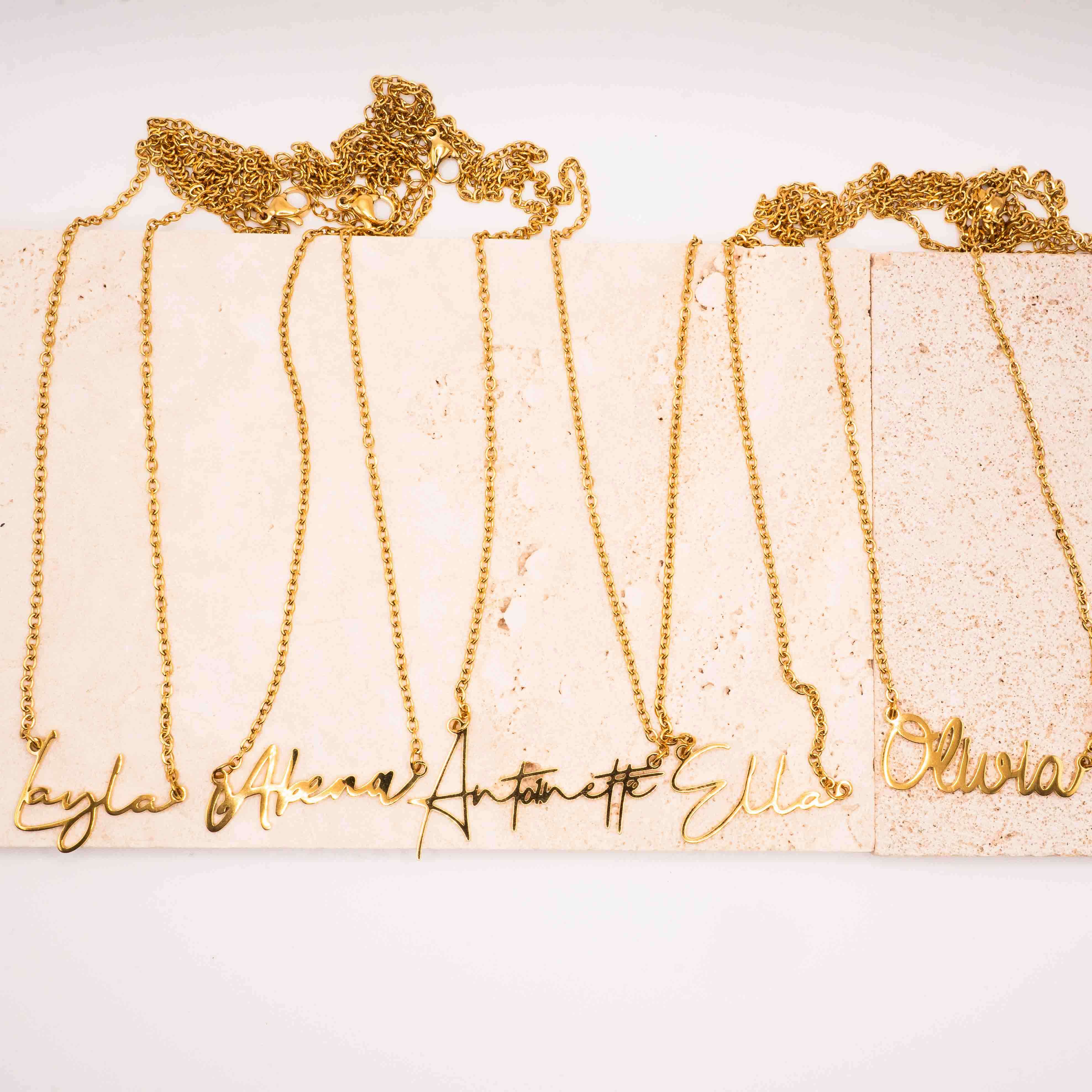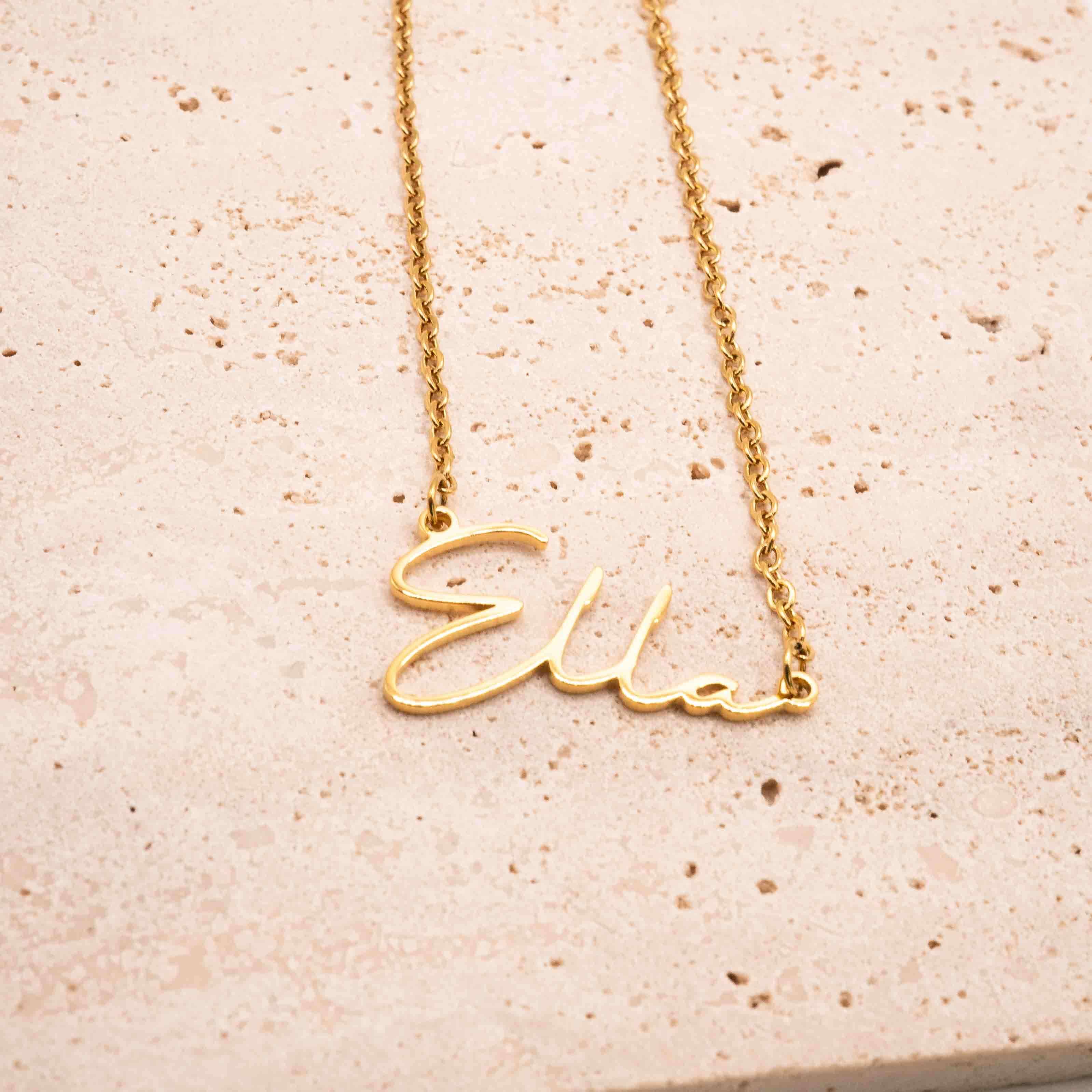 A delicate and meaningful custom Personalised Name Necklace featuring your chosen name or word in a sleek, modern font. Crafted from waterproof, tarnish-resistant 18K gold PVD over 316L stainless steel, it’s perfect for everyday wear—even in the shower or gym.