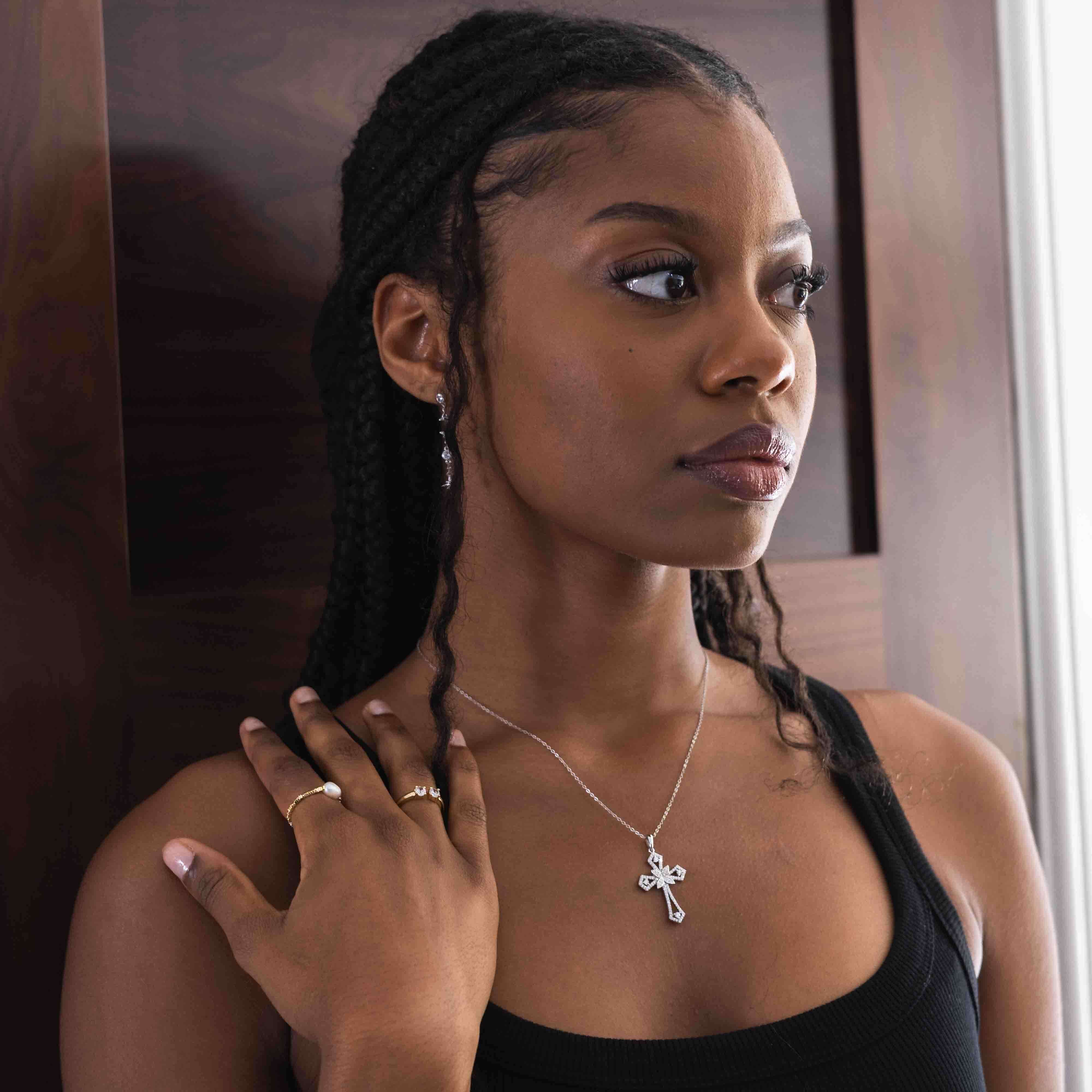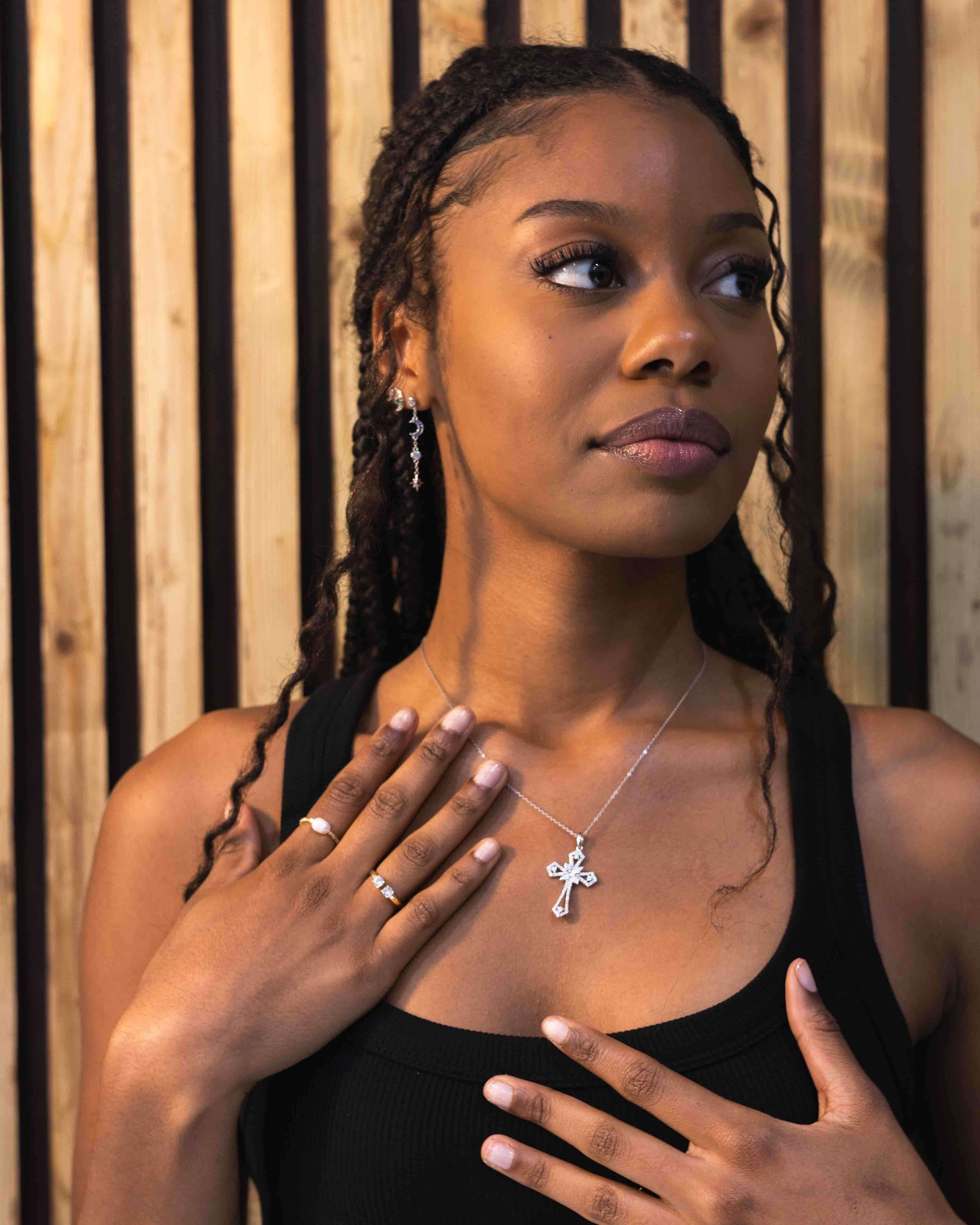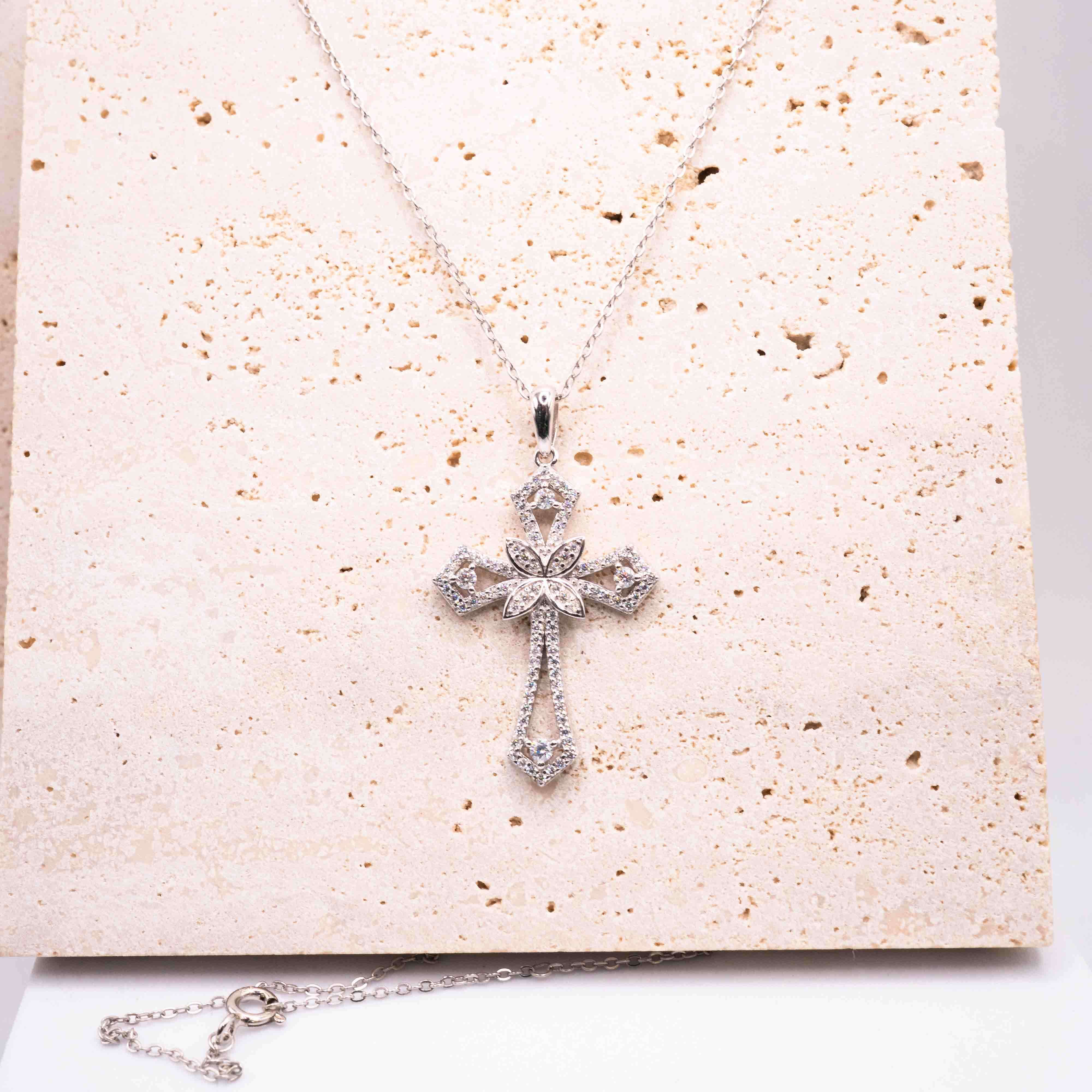 A timeless emblem of faith, grace, and renewal. The Radiant Cross Necklace features a finely sculpted cross adorned with pavé-set cubic zirconia stones and a graceful floral centre symbolising divine beauty and new beginnings.