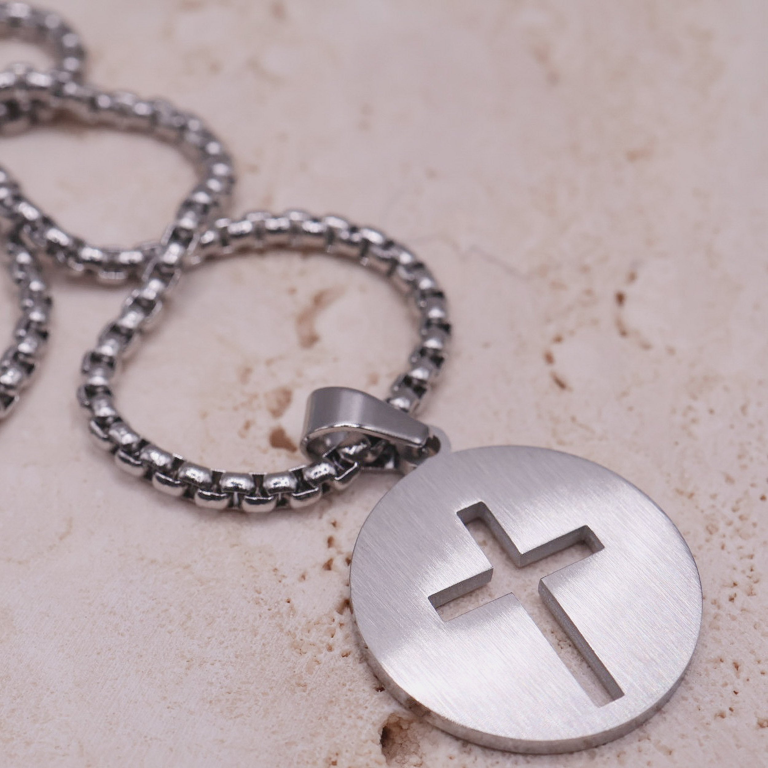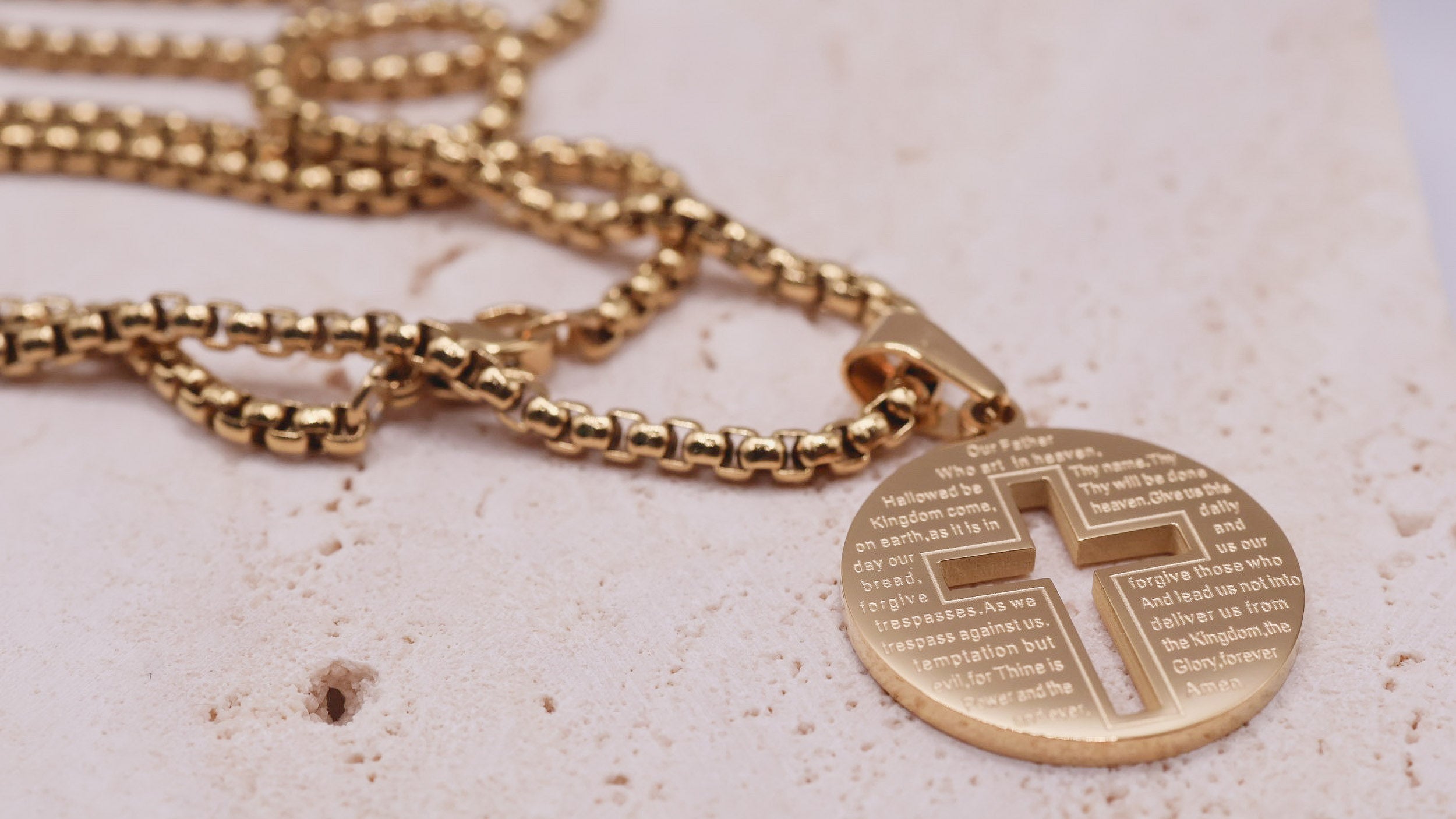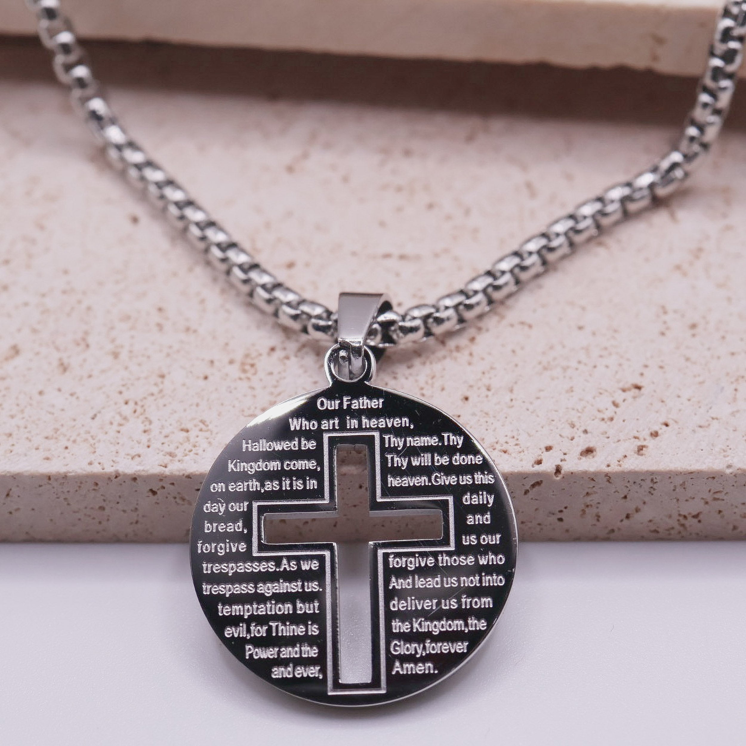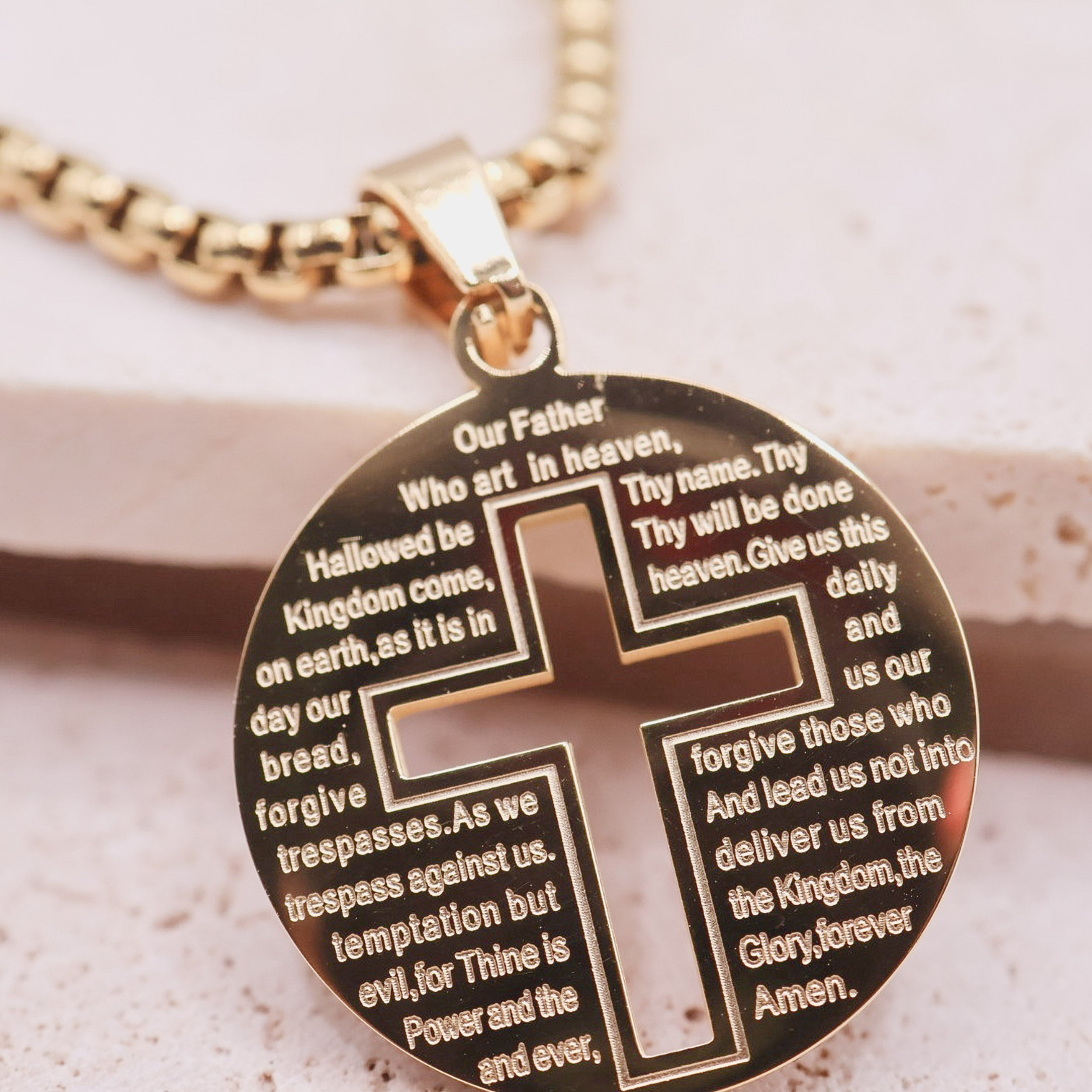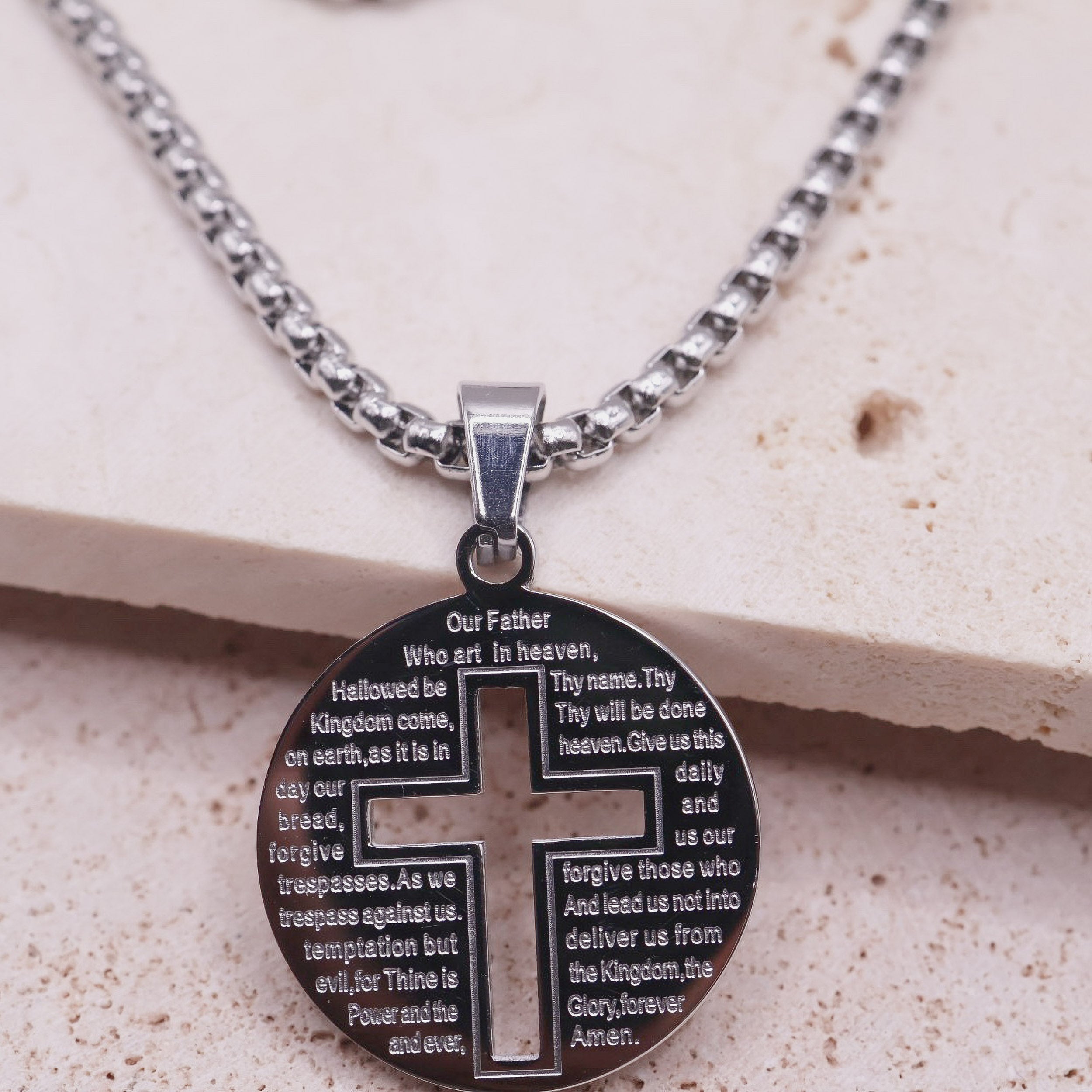 The Lord’s Prayer Cross Necklace features a circular stainless steel pendant engraved with the full Lord’s Prayer, centred around a clean cut-out cross. The balanced design and polished finish give the piece quiet strength and clarity.